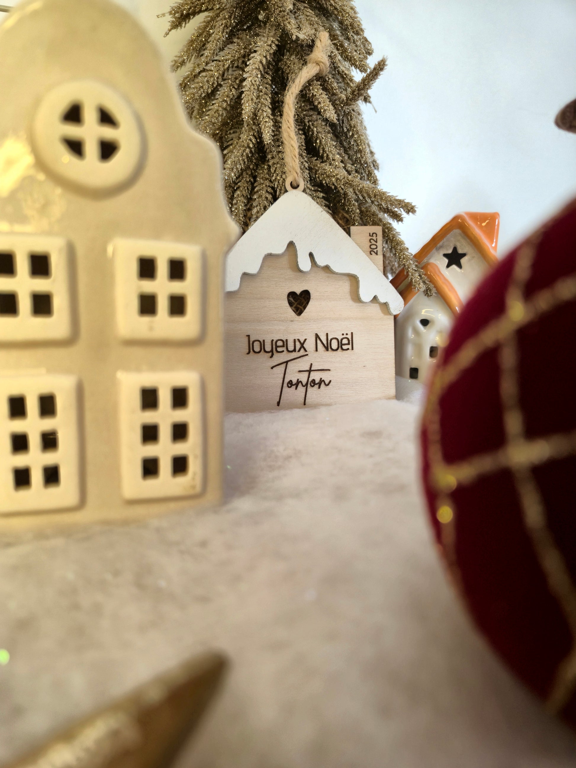 Apportez une touche d’amour et de tendresse à votre sapin avec cette adorable maison enneigée, gravée du message “Joyeux Noël” accompagné du prénom ou du rôle de votre choix : papa, maman, papy, mamie, tata, tonton, parrain ou marraine. Son toit recouvert de neige blanche et sa cheminée gravée de l’année 2025 en font une décoration unique et pleine de charme.